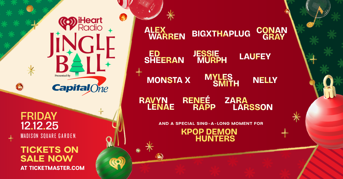 NEW YORK– Sept. 26, 2025- iHeartMedia will celebrate the holiday season across the nation with its annual “iHeartRadio Jingle Ball Tour Presented by Capital One” – the season's iconic holiday music event, with the year’s top artists including Alex Warren, BigXthaPlug, Conan Gray, Ed Sheeran, Jelly Roll, Jessie Murph, The Kid LAROI, Laufey, mgk, MONSTA X, Myles Smith, Nelly, Olivia Dean, Ravyn Lenae, Reneé Rapp, Shinedown, Zara Larsson and more. This year, the 2025 iHeartRadio Jingle Ball Tour Presented by Capital One will stop in Dallas/Fort Worth; Los Angeles; Chicago; Detroit; New York; Boston; Philadelphia; Washington, D.C.; Atlanta; and Miami.