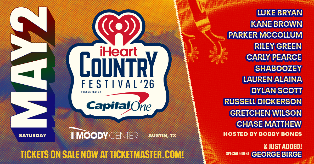 New York, N.Y. – January 13, 2026 – iHeartMedia announced today the return of the iHeartCountry Festival Presented by Capital One on Saturday, May 2, 2026. The thirteenth annual festival will feature performances by Country music’s hottest artists including Luke Bryan, Kane Brown, Parker McCollum, Riley Green, Carly Pearce, Shaboozey, Lauren Alaina, Dylan Scott, Russell Dickerson, Gretchen Wilson, Chase Matthew and special guest George Birge at the award-winning Moody Center in Austin, Texas. The festival is once again hosted by iHeartMedia's nationally syndicated top on-air Country personality, Bobby Bones.