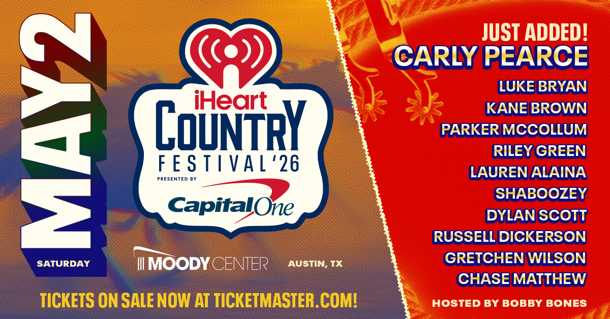 New York, N.Y. – January 13, 2026 – iHeartMedia announced today the return of the iHeartCountry Festival Presented by Capital One on Saturday, May 2, 2026. The thirteenth annual festival will feature performances by Country music’s hottest artists including Luke Bryan, Kane Brown, Parker McCollum, Riley Green, Carly Pearce, Shaboozey, Lauren Alaina, Dylan Scott, Russell Dickerson, Gretchen Wilson and Chase Matthew at the award-winning Moody Center in Austin, Texas. The festival is once again hosted by iHeartMedia's nationally syndicated top on-air Country personality, Bobby Bones.